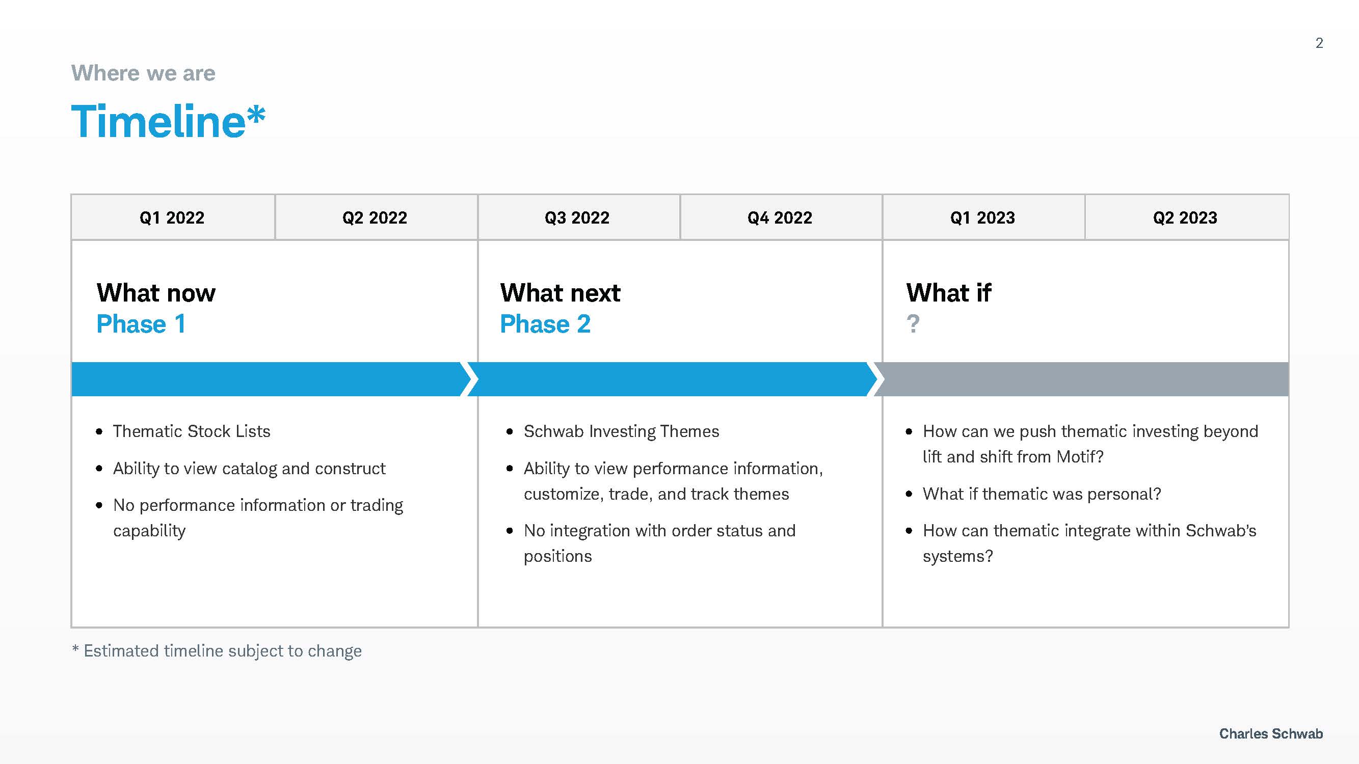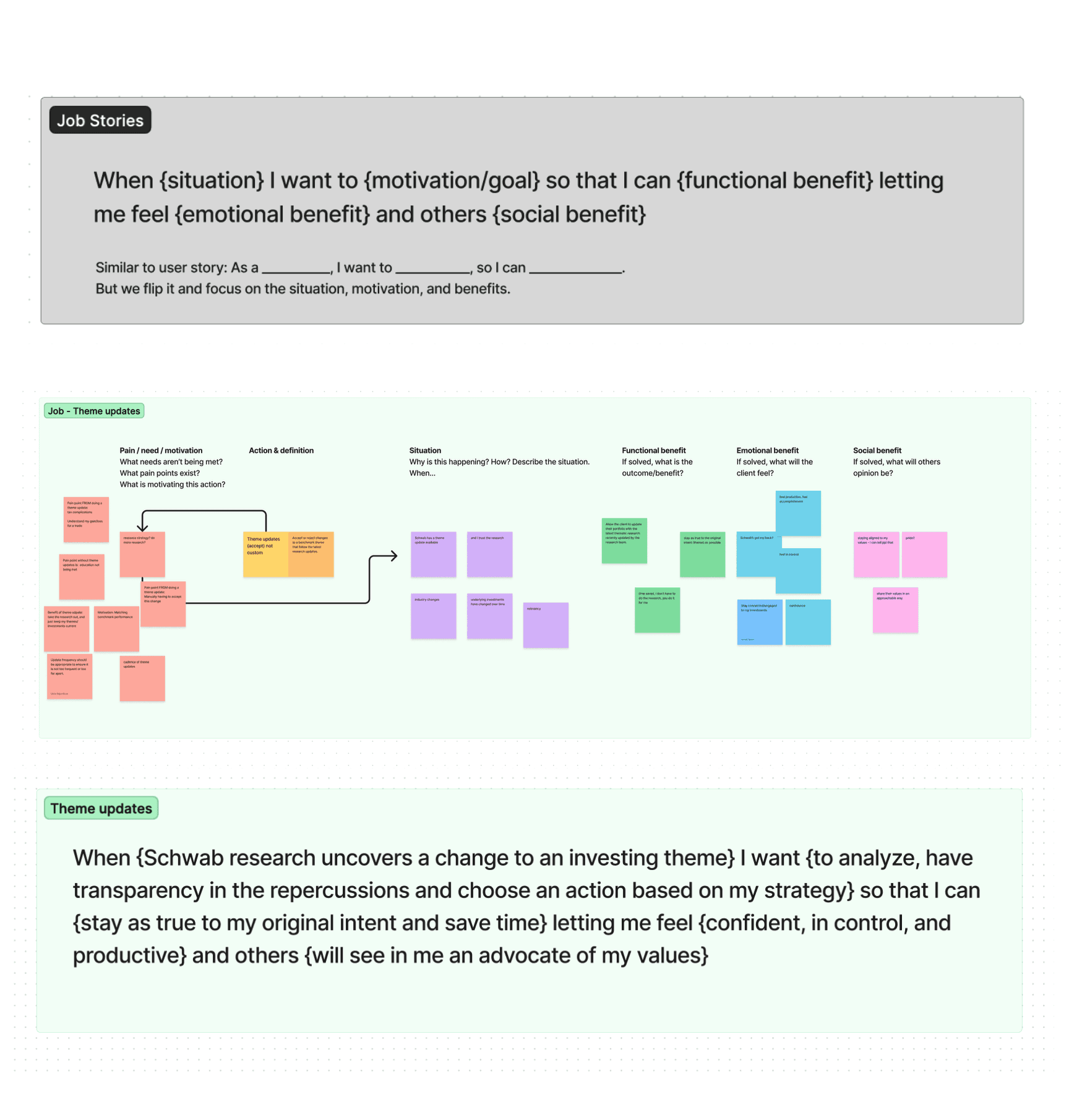 01/ Finally, I focused on alignment beyond product. Marketing and product teams were telling two different stories about what “Investing Themes” was. I invited marketing partners into our research sessions and design reviews so they could hear client reactions firsthand. The result was a unified message—clear, trustworthy, and grounded in user understanding—that carried seamlessly from Schwab.com through the trading interface, tutorials, marketing materials and how our advisors spoke of it.