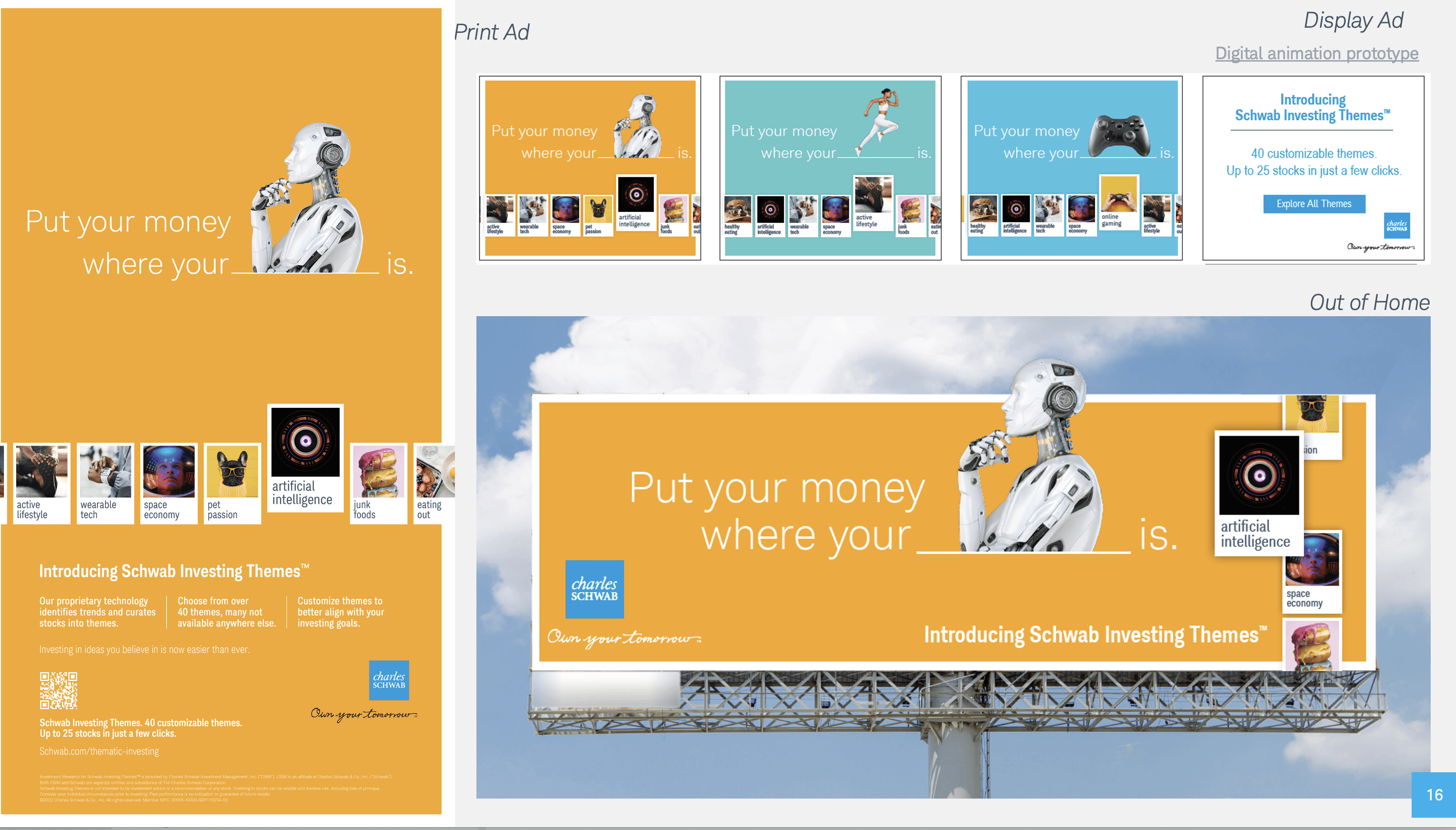 01/ Schwab Investing Themes exceeded every expectation. Within two years, it grew to $2.7 billion in Assets Under Management and continued to expand with 20% year-over-year growth—proof that investors connected deeply with the product’s concept and experience.